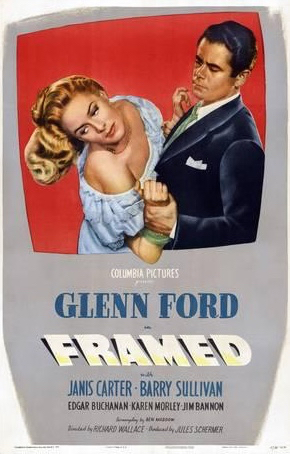 A Ned Scott poster art image demonstrates the link between Ned Scott still photographs and poster art. This is another example from a 1947 film noir mystery from Columbia Pictures starring Glenn Ford and Janis Carter. Glenn Ford’s character falls victim to the twisted murder plot of a small town seductive waitress, Janis Carter’s character. Upon discovering enough of the plot’s design, Ford confronts the deceitful Carter. The confrontation is the essence of the still photograph. Things are more complicated by the fact that these two had already become lovers. Director Richard Wallace’s dark mystery, Framed, 1947.