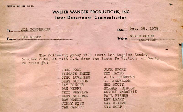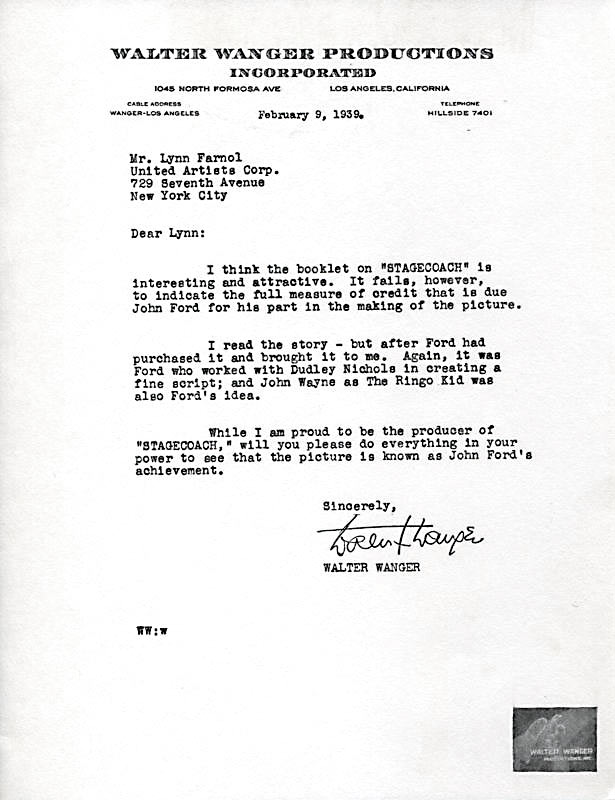 I think the booklet on “STAGECOACH” is interesting and attractive. It fails, however, to indicate the full measure of credit that is due John Ford for his part in the making of the picture. I read the story–but after Ford had purchased it and brought it to me. Again, it was Ford who worked with Dudley Nichols in creating the fine script; and John Wayne as The Ringo Kid was also Ford’s idea. While I am proud to be the producer of “STAGECOACH”, will you please to everything in your power to see that the picture is known as John Ford’s achievement.