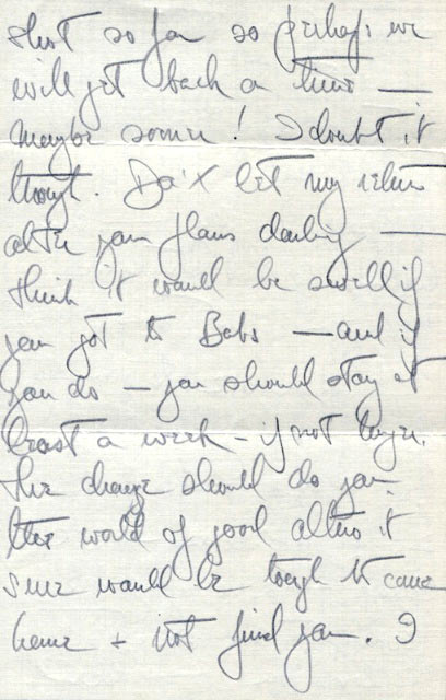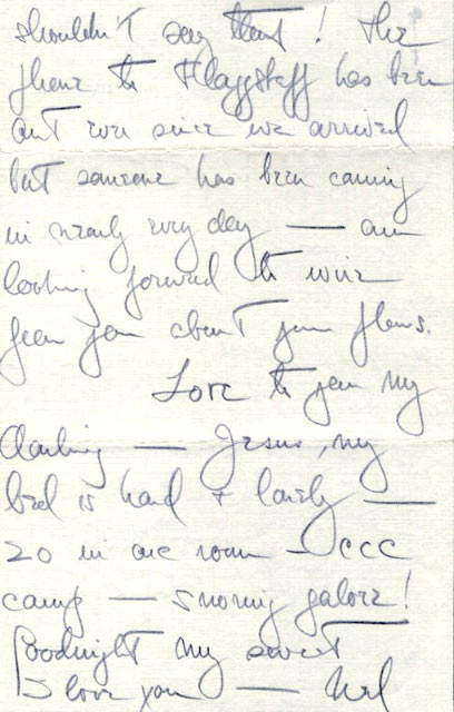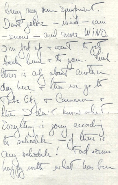 Readable copy of letter: Date: Wednesday Location: Kayenta, Arizona Dearest– I am writing only because if I don’t, I’ll catch hell when I get home–no–!–but I’ve been so goddamned tired and I’ve been so cold & busy that I’ve hardly had energy to write. They’re crazy–this outfit–up at 5 A.M. and back at 6 P.M. then I have to unload & load & have super & a shower & by that time I’m dead. So glad I didn’t bring my own equipment. Dust galore–wind–rain–snow–and more WIND. I’m fed up & want to get back home & to you. Think there is only about another day here & then we go to Tuba City & Cimarron & then I don’t know what. Everything is going according to schedule–if there is any schedule! Ford seems happy with what has been shot so far so perhaps we will be back on time–maybe sooner! I doubt it though. Don’t let my return alter your plans darling–think it would be swell if you got to Babs–and if you do–you should stay at least a week–if not longer. The change wouold do you a world of good altho it sure would be tough to come home and not find you. I shouldn’t say that! The phone to Flagstaff has been out ever since we arrived but someone has been coming in nearly every day–am looking forward to wire from you about your plans. Love to you, my darling–Jesus! my bed is hard and lonely–20 are in one room–CCC camp–snoring galore–Good night, my sweet–I love you–Ned.