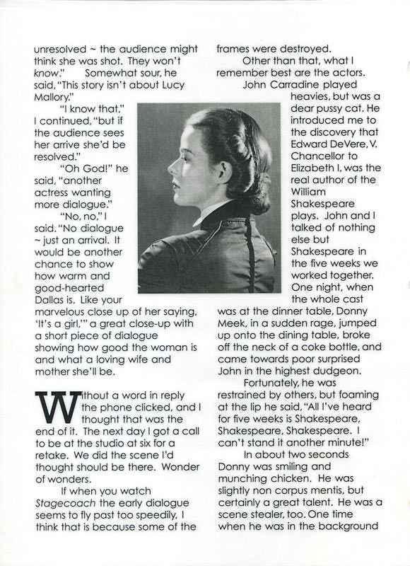 I’m so old that I can remember when a typewritten letter was just for business. My father even sent back a letter of mine because it was not handwritten–I use that as a rationale for remaining computer illiterate–it seems to me that labor-saving devices actually take too much time. You have asked me to remember and so I shall. Some of Stagecoach seems as close as yesterday–the rest has faded into a cloud. The reason I am the sole survivor (of the cast) is that I was the youngest–I had a twenty-fourth birthday in the last seek of shooting. I will write things from that film as they come to me. Claire Trevor was the most beautiful-hearted person that I had met, or ever met. We remained friends all those years since tho only by mail or the telephone. I cannot bear the sadness of her dying even tho’ considering age alone it was to be expected. Alas! My own is the only departure of which I am certain. All whom I love should never die–. She read the Oz books during the five weeks we were shooting–I think she finished Quickly Duild of Oz on the last day! She said she never read them or had them read to her when she was a child;that the longing to have had that churned in her mind too often–she reasoned that the only was to use her head for better things was to get rid of the invasive regret of never having had them. She said much later when I asked, that it had done the trick–I received a last letter from her just before she died. Tim Holt and I looked alike! Perhaps that was because our fathers have exact images of one another–in fact I flew at Jack Holt when he came on the set to visit Tim. I thought he was my own dad! John Carradine played heavies but was a dear pussy cat. He introduced me to the discovery that Edward De Vere, V.Chancellor to Elizabeth !, was the real author of the William Shakespeare plays. I have been obsessed with this identification ever since and hope that it will by fully accepted in my lifetime which gives the theory at least a year to explode. John and I saw one another rarely in N.Y. He was as marvelous on the stage as in movies. It was his voice and that long-boned face plus compete and basic honesty. John and I talked of nothing else in the five weeks we worked together except Shakespeare. When the whole cast was at the dinner table before some Stagecoach event or other, Donny Meek (Donald Meek) in a sudden rage jumped up onto the dining table, broke off the neck of a coke bottle and came towards poor surprised John (Carradine) in the highest dudgeon–fortunately he was restrained by others but foaming at the lip he said, “All I’ve heard for five weeks is Shakespeare, Shakespeare, Shakespeare. I can’t stand it another minute.” In about two seconds Donny was smiling and munching chicken. Donny was lightly non compos mentis but certainly a great talent–he was a scene stealer, too. One time when he was in the background of a barroom scene of someone’s close-up he reached for a slice of bread and with it wearily wiped his brow as though it was an unbearably hot summer day. You have to look sharp but part of his antic is still there. You have specifically asked about Tommy Mitchell. Although I had known him ever so slightly in New York, he did not know me then and never indicated any memory of a certain occasion ie: I was sent to Philadelphia to replace a certain actress in a play which was directed by Tommy. As instructed I went to Philadelphia and saw he play. The sage manager came to me and said “Unfortunately the director is not here. ” “That’s Okay”, I said. “I’ll find him.” I went to the bar, and sure enough Tommy was there, stoned. “Mr. Mitchell,” I said, “I’m Louise Platt and I have just seen your play and…”. “Don’t tell me,” he interrupted, “don’t ell me what you think of it.” “I like it very much,” I said, “but I think the ingenue is really good.” “there’s always an actor who must pay by sacrifice,” he said. “Anyway,” I said, “There’s no point in replacing her. “She’s much better than I would be.” I went back to New York. The play opened. It wasn’t a hit but it wasn’t a flop, either. The play had problems nothing to do with the actors. Tommy was right, though–when a play is in trouble certain of the cast will always be sacrificed on the altar of the theater-God. The young ingenue had been replaced–no better–no worse. During Stagecoach our former meeting was never acknowledged so I assumed the occasion had faded into the mist–and yet: Tommy invited me and John Barrymore to his house one afternoon–tea was served–then he stood before the fireplace and with tears in his eyes he told this story: “You probably know that at one time I was a hopeless washed-up slob–I lost the people most dear to me. My wife, the best woman in the world was very patient but finally, sadly could no longer accept me as I had become–she and my daughter left me. I wept and wept and wept.” I’ve invited you here because I want you two especially to know what has happened. I have not had a drink in two years. I have courted my wife and daughter. My wife accepted my marriage proposal of yesterday afternoon. We’re having a wedding to which you two are the first to be invited”–so saying he raised his tea cup. We three raised ours in celebration–John Barrymore went on the wagon for eight months after that and I thought that perhaps Tommy had remembered after all–that e invited John because John was a hopeless inebriate and because I had once seen Tommy in his cups. I certainly remember that afternoon–one of the best of all moments. I can vaguely recall the wedding–J.B. was completely charming and told anyone and everyone proudly that his present sobriety was in honor of Tommy Mitchell, the groom. An appointment was made at Walter Wanger’s office to meet John Ford and Dudley Nichols. As you probably know practical jokes were legendary in those days. Spec
