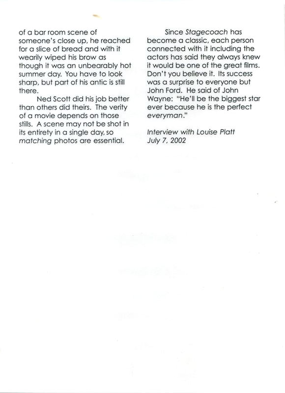 | “In 2003-2003 the Ned Scott Archive collaborated with the Cowboy and Western Heritage Museum to mount an exhibit honoring the making of the movie Stagecoach in 1939. Among the many interesting features in the exhibit was an edited excerpt from a letter written by cast member Louise Platt in 2002. In her letter, Louise reminisces about the process of filming the movie. She recounts tales about John Wayne, Claire Trevor, Thomas Mitchell, John Ford, John Carradine and other key members of the production. Her letter stands alone as an artifact by itself, offering a brief glimpse into the inner workings of film production.